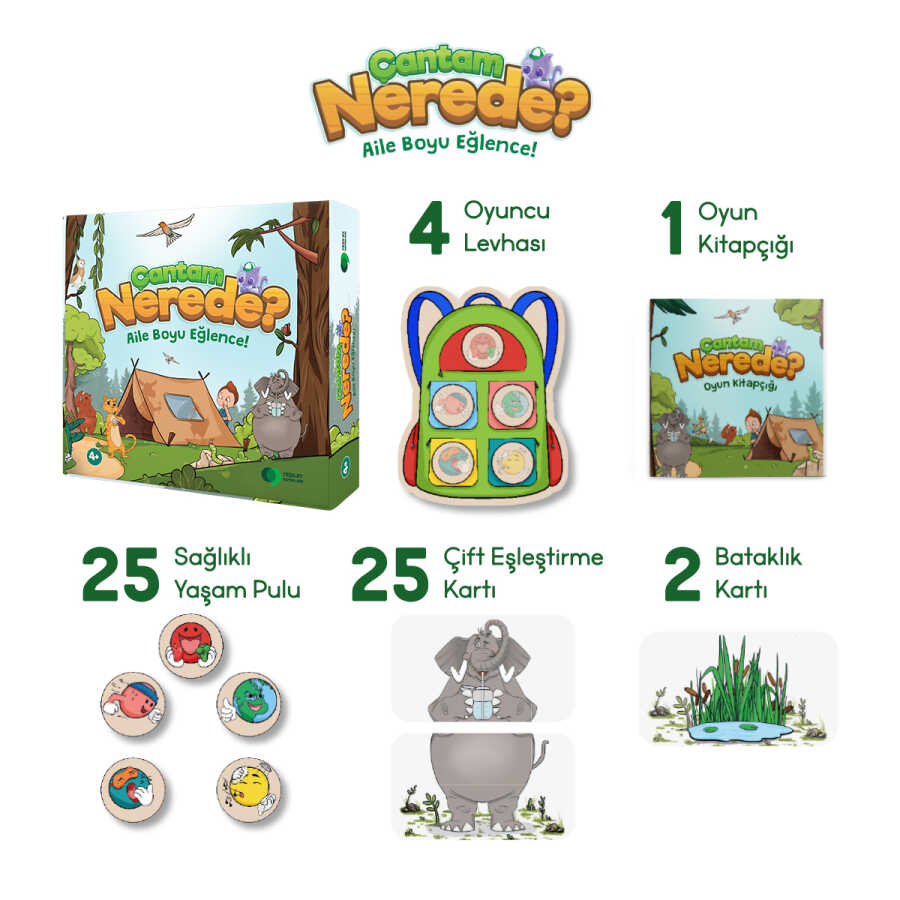 “Çantam Nerede?”, çocukları doğayla iç içe bir maceraya çıkarırken sağlıklı yaşam alışkanlıklarını eğlenceli bir oyun diliyle buluşturan aile dostu bir kutu oyunudur. Yeşilcan’ın kaybolan çantasını bulmak için ormanda ilerleyen oyuncular; temizlik, beslenme, hareket, uyku ve çevre bilinci gibi temel yaşam becerilerini keşfeder.