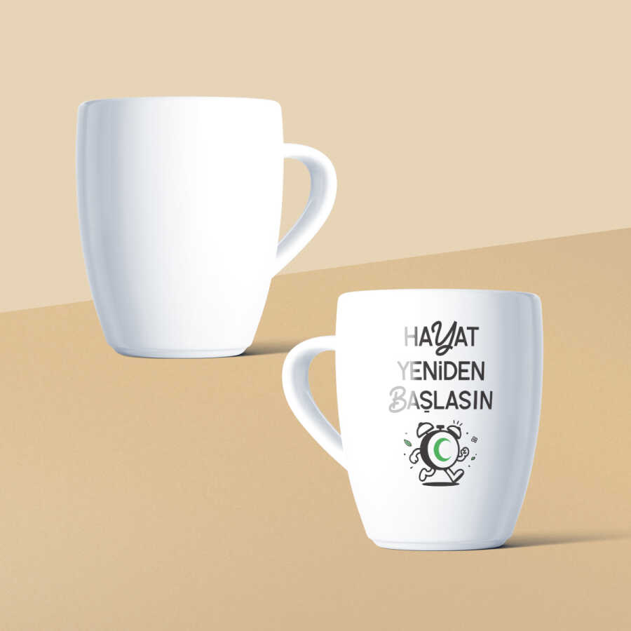 Hayat Yeniden Başlasın Çalar Saat Mottolu Beyaz Seramik Kupa – 300 cc