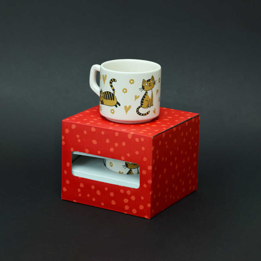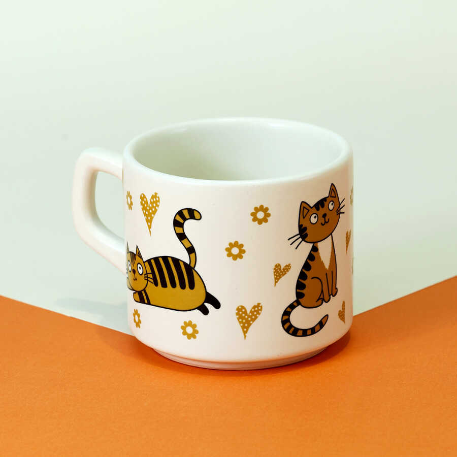 Kedi Desenli Kalp ve Çiçekli Seramik Kupa